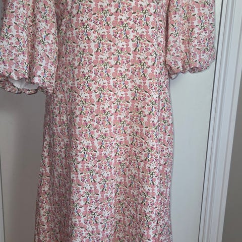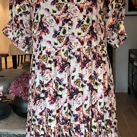 Innsvinget mønstret halvlang /midi kjole fra Marks & Spencer - str. 38. Står oppført som str. 12, men vi si ca en str. M. Mønster i lys lilla, rosa og sort. Veldig delikat.