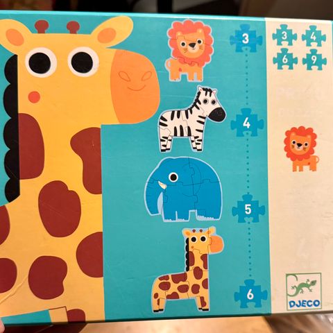 Puslespillet med 9 dyr i esken. Fint ,synlig brukt med mye bruk igjen. Passer fra 2 år .