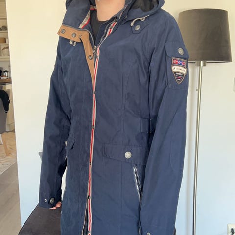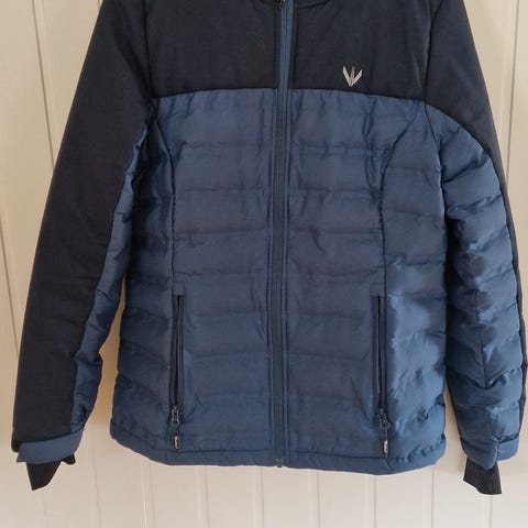 Artic North sporty jakke. Jakken er blå og har en lengde som dekker hoftene. Den har glidelås og knappestenging foran, samt lommer med glidelås. Jakken har hette og er laget for utendørs bruk.