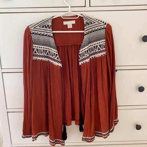 En flott jakke eller som cardigan - kun brukt et par ganger av min mor. Figursydd, flott kvalitet, litt dypere farger enn på bildene. Lengde fra skulder og ned 58 cm. Ermene er lagt opp, lengde fra armhule 35 cm. To lommer, trykknapper. Ny kr 2500.