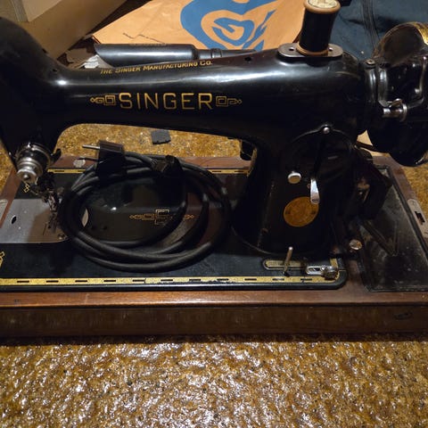 Dette er en Singer modell 66, produsert 16. november 1933. symaskin med el motor, og pedal, fungerende,