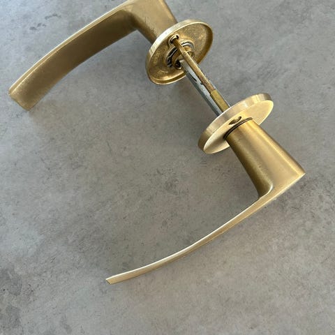 Utvendig dørhåndtak av messing med returfjær beregnet for ytterdører med modullåskasse.