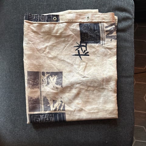 Pent dusjforheng med 10 «klyper». Hvitt med varierte blå «dråper».