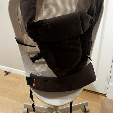 Ergonomisk anbefalt bæresele kan brukes på rygg eller mage og har oppbevaring til flaske og bleie.