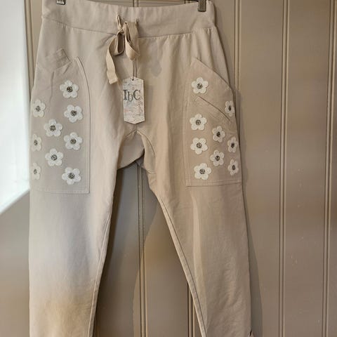 Beige ny bukse med strikk i livet og nederst på bena, romslige lommer foran, Str M selges kr 150,-(12)