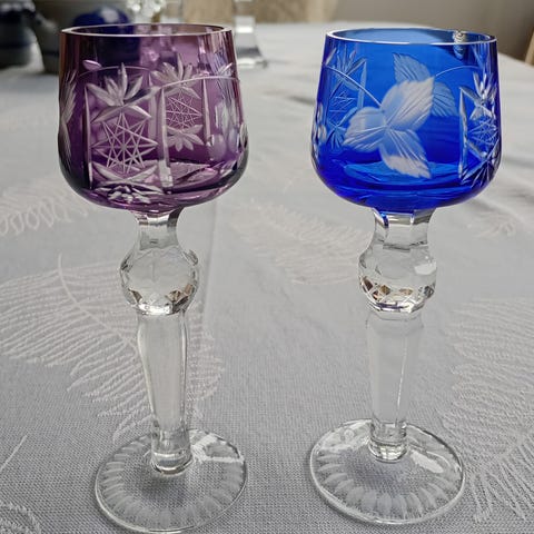 To nydelige krystallglass i lekker burgunder / dyp, mørkerød farge. Feilfrie og en fryd for øyet. Perfekt for en spesiell anledning eller evt som dekor i et vindu eller en glasshylle. Vintage og spesielt flotte.