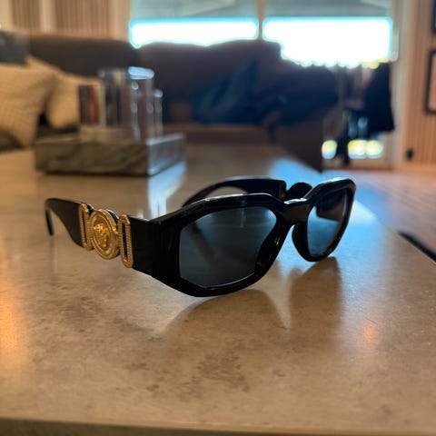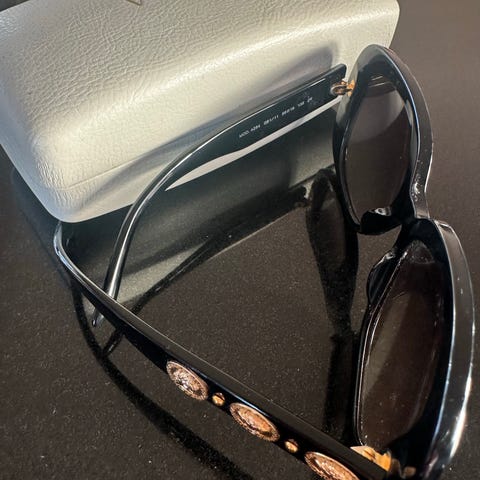 Ørsmå riper i glasset. Versace-emblemene på hver side har falt av (vanlig problem hos Versace med pålimte emblem). For egen del synes jeg de er finere uten... Likevel selges de derfor ganske rimelig. Nypris ca. 200 USD.