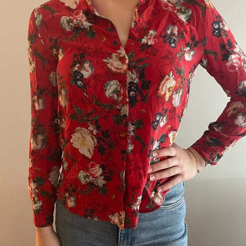 Lekker FWSS silkebluse i rød/oransje m blomster str L selges