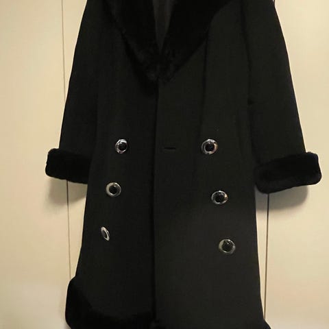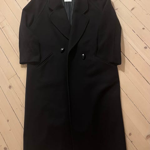 Klassisk lang ullkåpe i dyp rød fra Levérs of London. Pent snitt med slagkrage, dobbeltspent lukking og lommer. Rekker til under knærne - 130 cm lang.