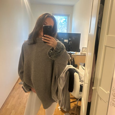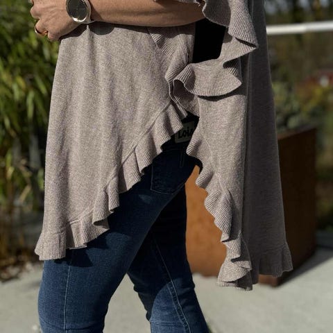 Rue de Femme cape i ull. Lekker cape, poncho i ull. Den er grå med okergule og sorte striper. Capen har belte til å knyte i midjen. Varm og god ullcape. Bruk den over f.eks skinnjakke eller en god genser. Den erstatter fin en jakke i overgangen mellom sesongene.