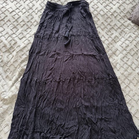 Nydelig skjørt med underskjørt og split foran. Tynt, gjennomsiktig stoff foran, med underskjørt i tett stoff. Elastisk bånd i midjen. Farge: lys blå/lilla. Lite brukt.