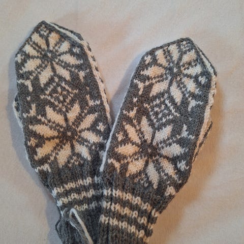 Hvite og grå og grå og hvite nydelige Selbuvotter i ull til salgs kr 200 pr par.