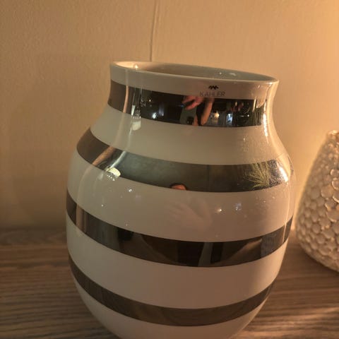 Vase - kahler vase i hvit og sølv. Selges for 99 kr.
