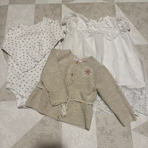 Retro dress til baby. Ingen hull eller skader som jeg kan se. Med votter som henger på. Står strl 74 inni dressen (se bilde). Med hører på hetten.