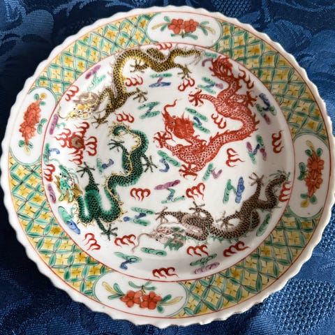 Kinesisk porselenstallerken Family Rose med gull - fin til å henge på veggen