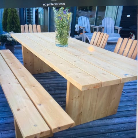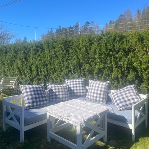 Et nytt sett med hagemøbler selges. Det har ikke vært brukt. Det er laget av impregnert treverk og malt med terrassemaling. Selges til materialpris.