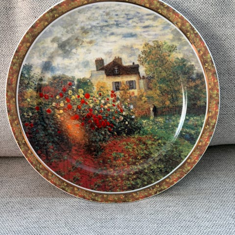 Diameter er ca 24 cm. Håndlaget, med nydelig, skinnende gulldekor. Har oppheng for vegg, men kan også brukes på andre måter. Bør ikke vaskes i maskin.