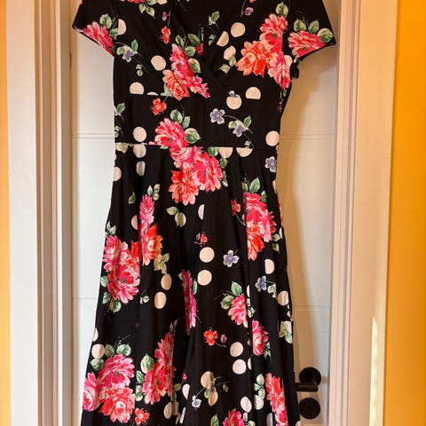 Kjole med sort bakgrunn og blomster(orkideer og peoner) i rosa og lilla toner. Kjolen har lommer