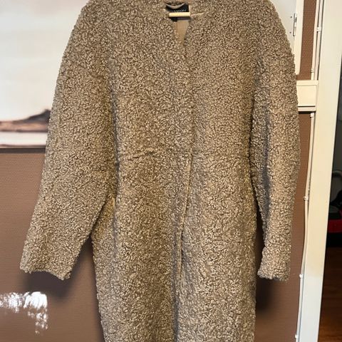 Kamelfarget, perlestrikk,lang jakke/kåpe.