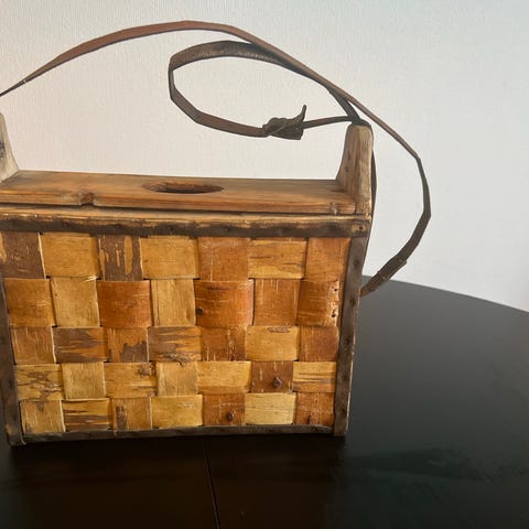 Gammel flettekurv , med to håndtak , 23 cm høg , 31 cm lang , til salgs
