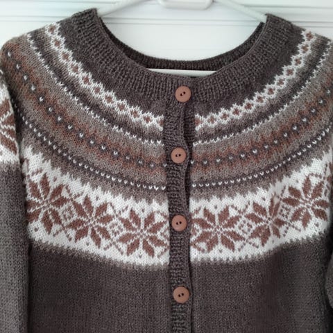 Hjemmestrikka Nancy kofte. Ca str.M. Svært lite brukt, da den ikke passet helt til meg. Syns mønsteret er strikket litt stramt, men det er kanskje smak og behag. Alpakkaull.