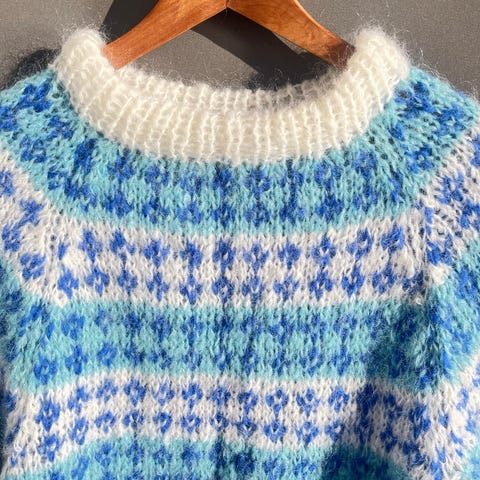 Ny cloud genser strikket med to tråder chunky mohair selges. Garnet til denne genseren kostet 1800,-