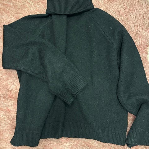 Deilig og myk genser med spesiel detalj på erme. Rett modell. Svart, halvhøy hals. Kan også passe str L.