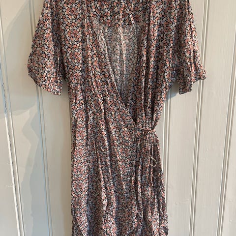 Wrapkjole med knyting i siden. Strikk i kanten på ermene.
