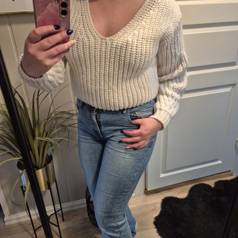 Completey new rib knit sweater in a beautiful off white color. Size S. Never used. Super soft and comfortable. Very stretchy.