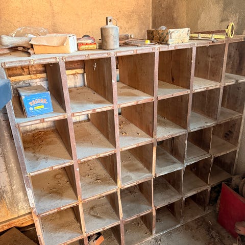Diverse deler til teak hylle seksjon.