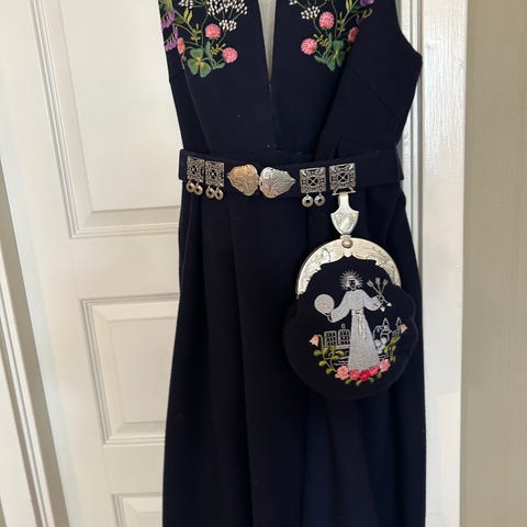 Sølvet bør pusses og det finnes merke på beltet etter oksidert sølv. (Bilde nr 12) Det er ikke synlig når vesken henger på. Det er også mulig dette kan vaskes bort med sponsåpe, men jeg har ikke tort å prøve. Resterende søljer/knapper følger ikke med da det nå pryder en annen bunad.