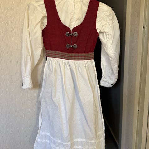 Ny Trønderbunad rød m enkel rose på vesten og forkle rose. Stoff kjøpt hos Husfliden. Følgende mål: