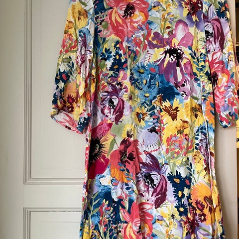 Sommerkjole i flerfarget design, størrelse 38. Kjolen har et blomstrete mønster og er laget for å passe til sommerlige anledninger. Kjolen er ikke brukt.