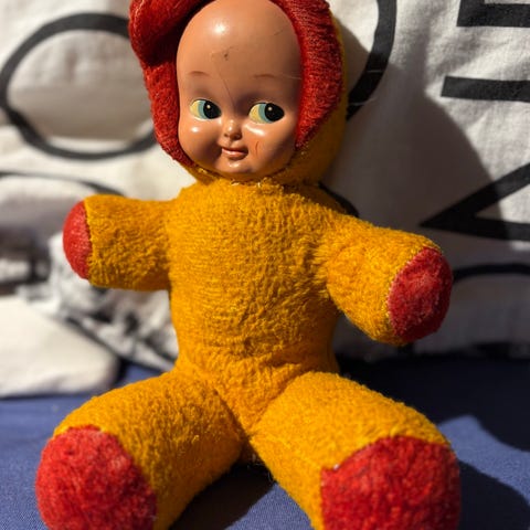 Vintage 1950s/60s Langbeint stoff dukke med malt ansikt.