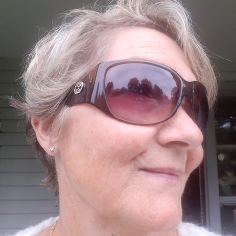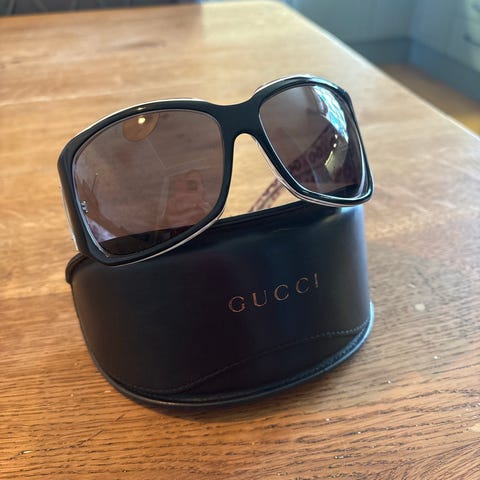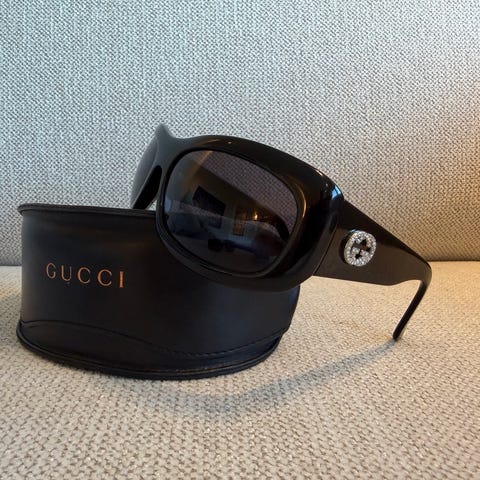 Pent brukte Gucci solbriller selges. Gammelrosa farge, og 1990/2000talls stil.