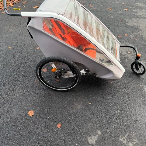 Demper på begge hjulene, regulerbare seler, god brems. God plass til to barn.