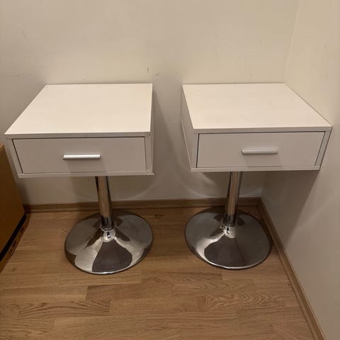 Selger 2 stk nattbord ifra Rocka. Robuste og stilfulle bord med skuffe og hylle inni.