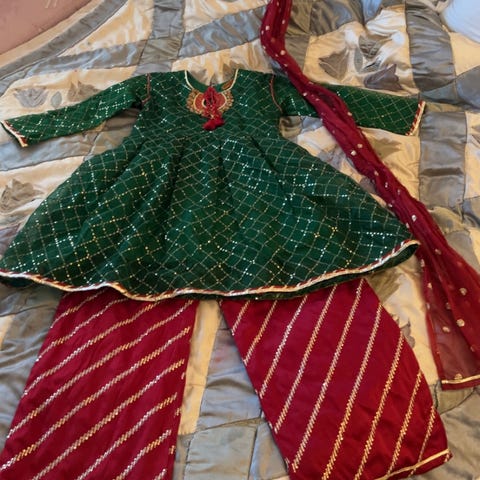 En helt nydelig afghansk kjole som er aldri brukt. Fikk det gave, men hadde glemt den og rakk ikke å bruke den. Den ble dessverre for liten fortere enn tenkt. Veldig fine farger