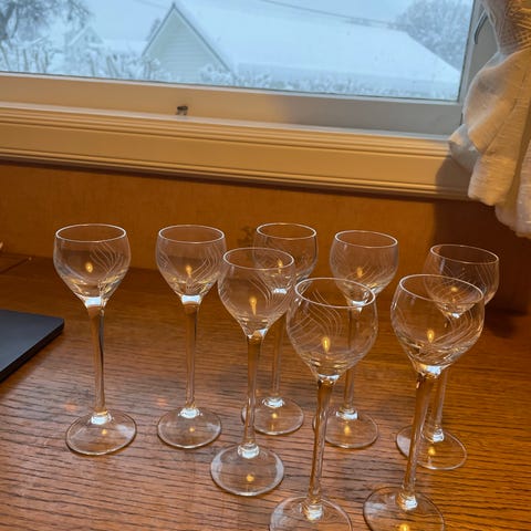 4 krystall likør glass fra Rona Slovakia kjøpt i Riga for ca 28 år siden. Selges samlet for 300,-