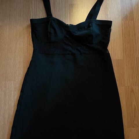 Mind kjole med stropper i str 40-42, M. Elastisk og lettstelt. Svart på farge med grått for som skinner litt gjennom. Fløyelspynt nede, både foran og bak. Lite brukt og fremstår som ny.