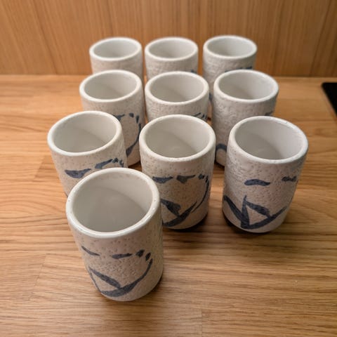 Håndlagede tur glass til noe godt. De er laget i keramikk og tre, håndmalte, total høyde 9 cm og de rommer ca 3,5 cl. De står stødig i trefoten sin.