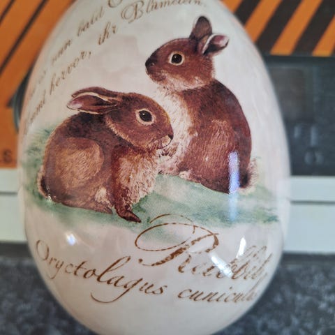 Håndmalt påskeegg i porselen. 15 cm langt, omkrets 29 cm.