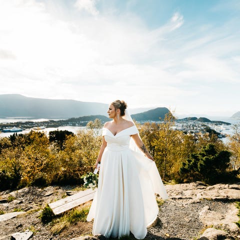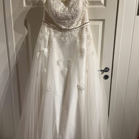 Kjøpte en brukt kjole som desverre ikkje passet meg. Str 34 men passer for 36 også. Følger med slep også.