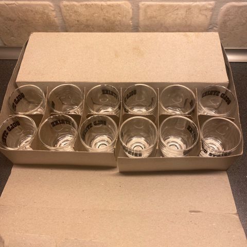 1. NYE 24 stk. blanke snapsglass Gold strike snapse glass, med sort skrift. Ligger fremdeles innpakket i orginalesken.