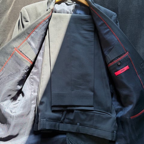 Gråmønstret dress fra Hugo Boss. Bukse og jakke i størrelse 50. Dresspose medfølger.