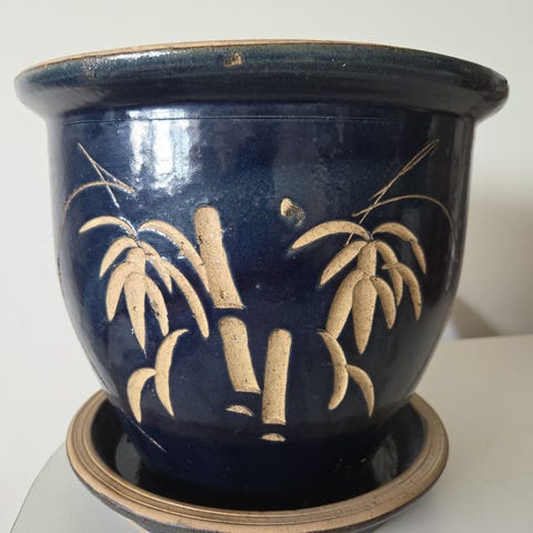 Selger en spesiell eldre blomsterpotte med motiv av en hane og en høne. Merkelapp under med « The Lansdowne collection» Er sannsynligvis kjøpt i England, men selve potten er produsert i Italia. Tilhørende underskål følger med.