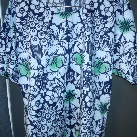 Jeg selger en lite brukt bluse/topp fra Marimekko. Den er sort i bunnen, med rosa og beige mønster. 100% viskose. Det følger med et belte i samme stoff.