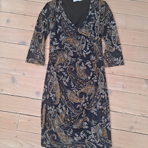 Tettsittende kjole fra Floyd med rynkete/liten puff på skuldrene. Lengden er ca til midt på lårene, og jeg er 166cm høy. Størrelse S.