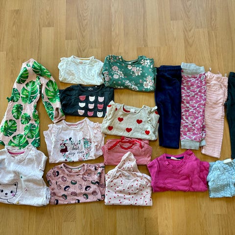 Stor klespakke til jente i str 104. Flekker, små hull og slitasje forekommer noen steder.