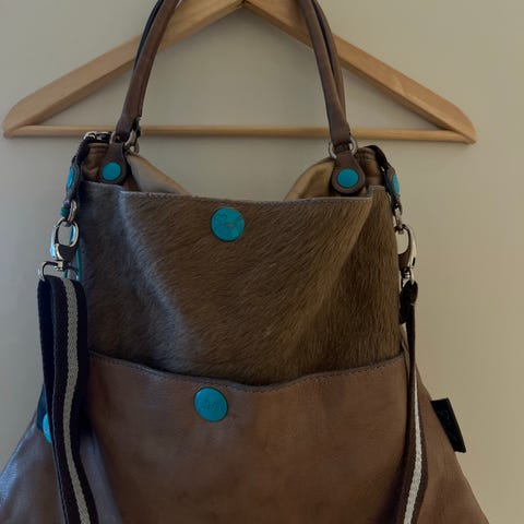 Tøff crossover veske fra engelske Tamara Fogle i skinn og stoff fra gamle kaffebønnesekker